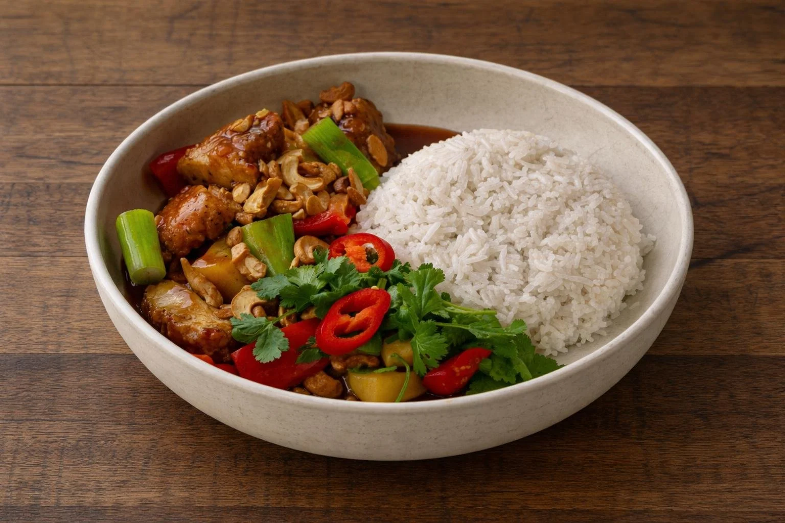 Fried chicken filet in Tonkin’s homemade “SSS-sauce”, bell pepper, spring onion & cashew nuts.
