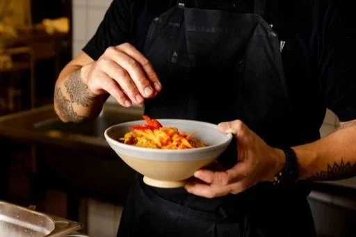 Slow cooked beef chunks w/ carrots & chili oil, topped w/ thai basil, crispy onion, coriander & chili.