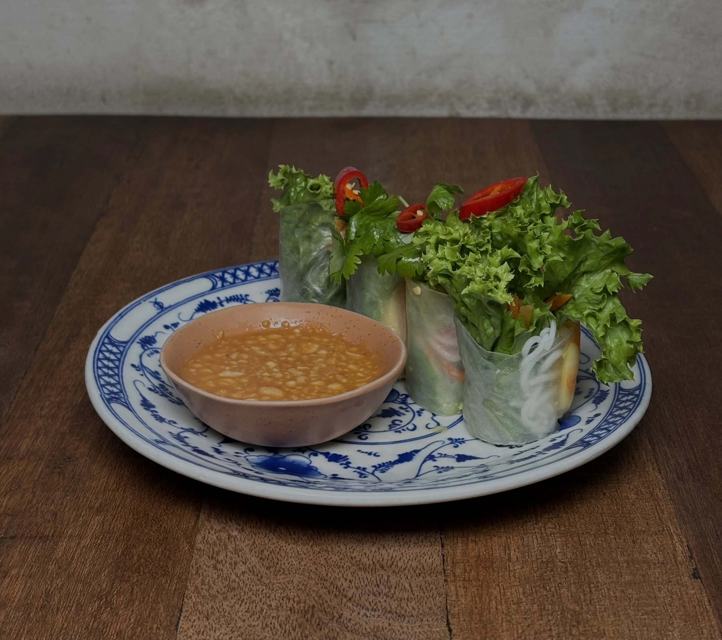 Fresh rice paper rolls w/ chicken, cucumber, pickles, salad, rice noodles, herbs & chili, served w/ hoisin peanut sauce.